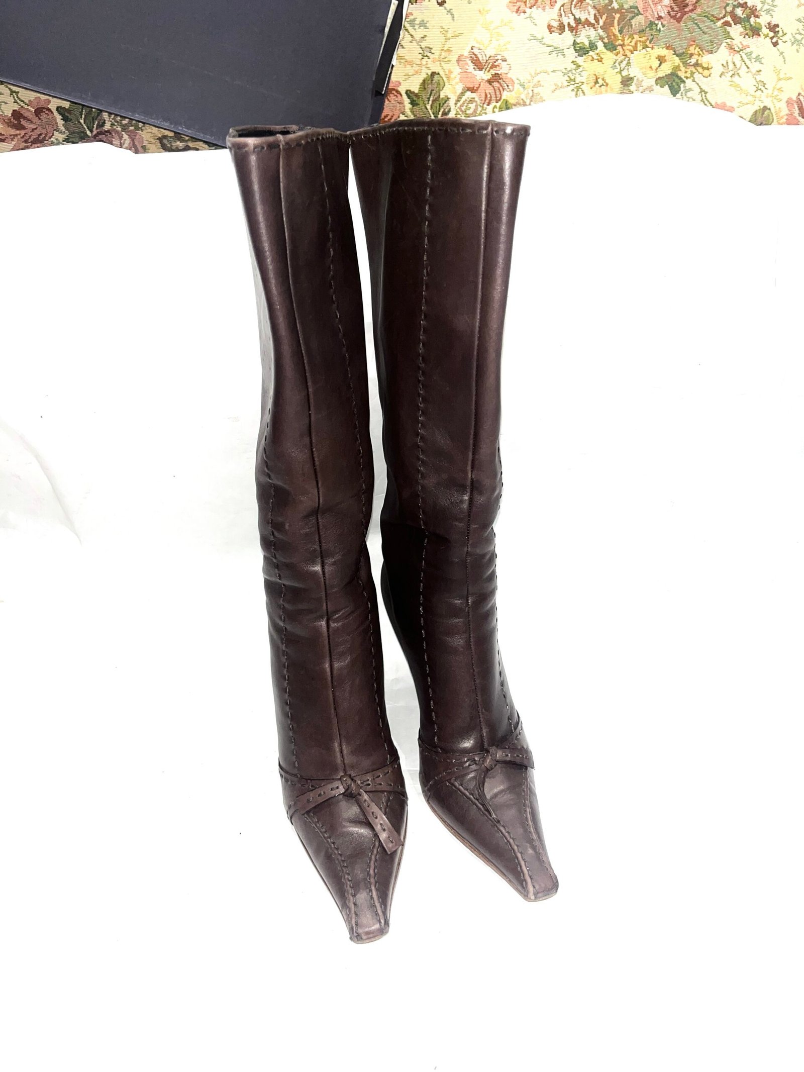 Knee-high boots with visible stitched seam construction and elongated pointed toe and bow tie details.