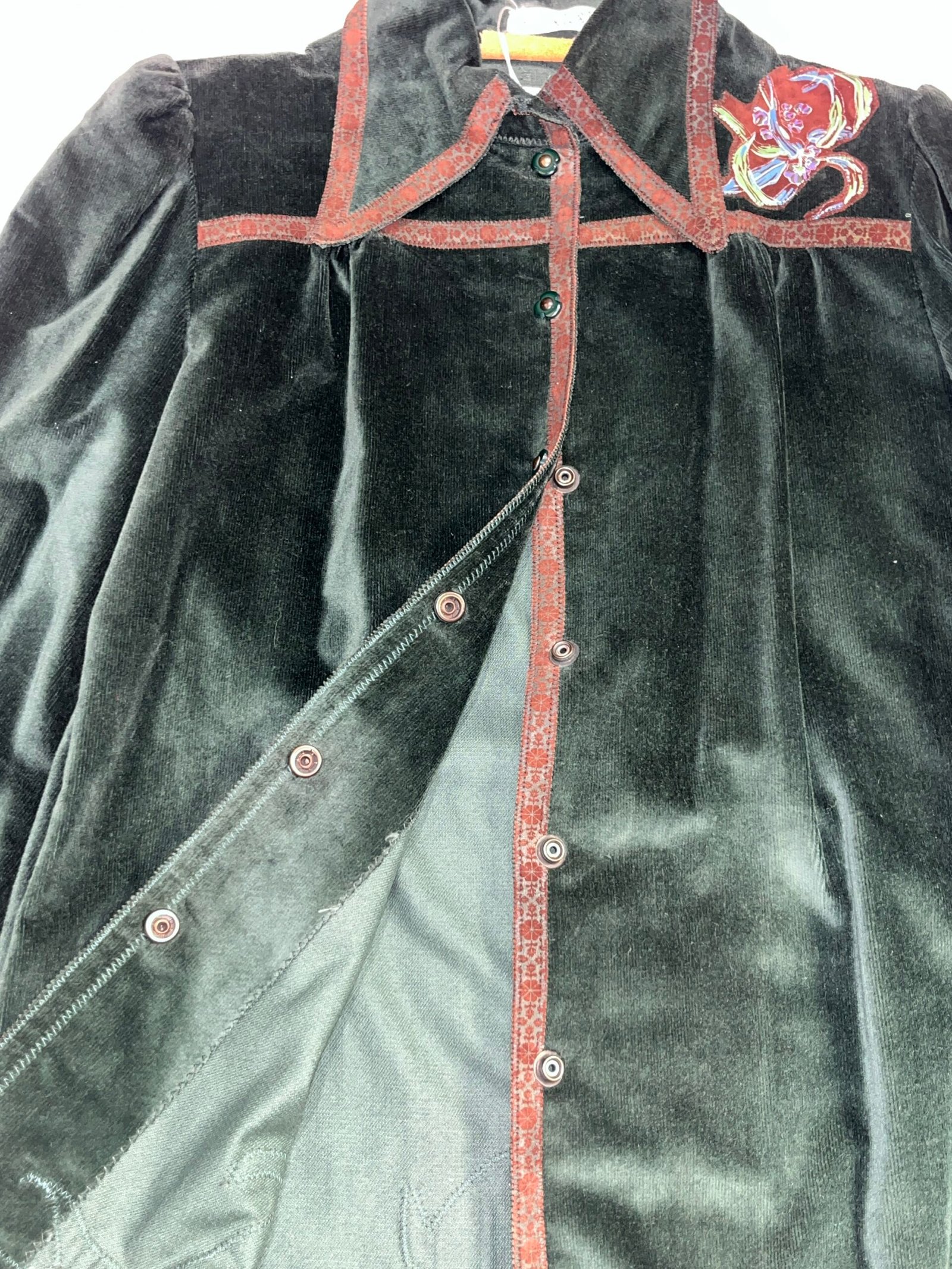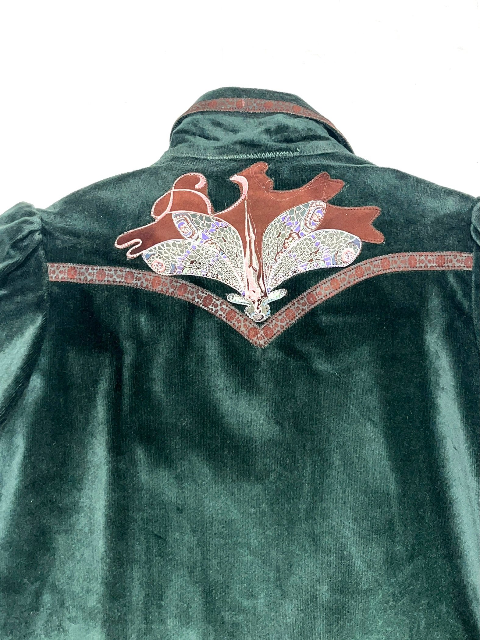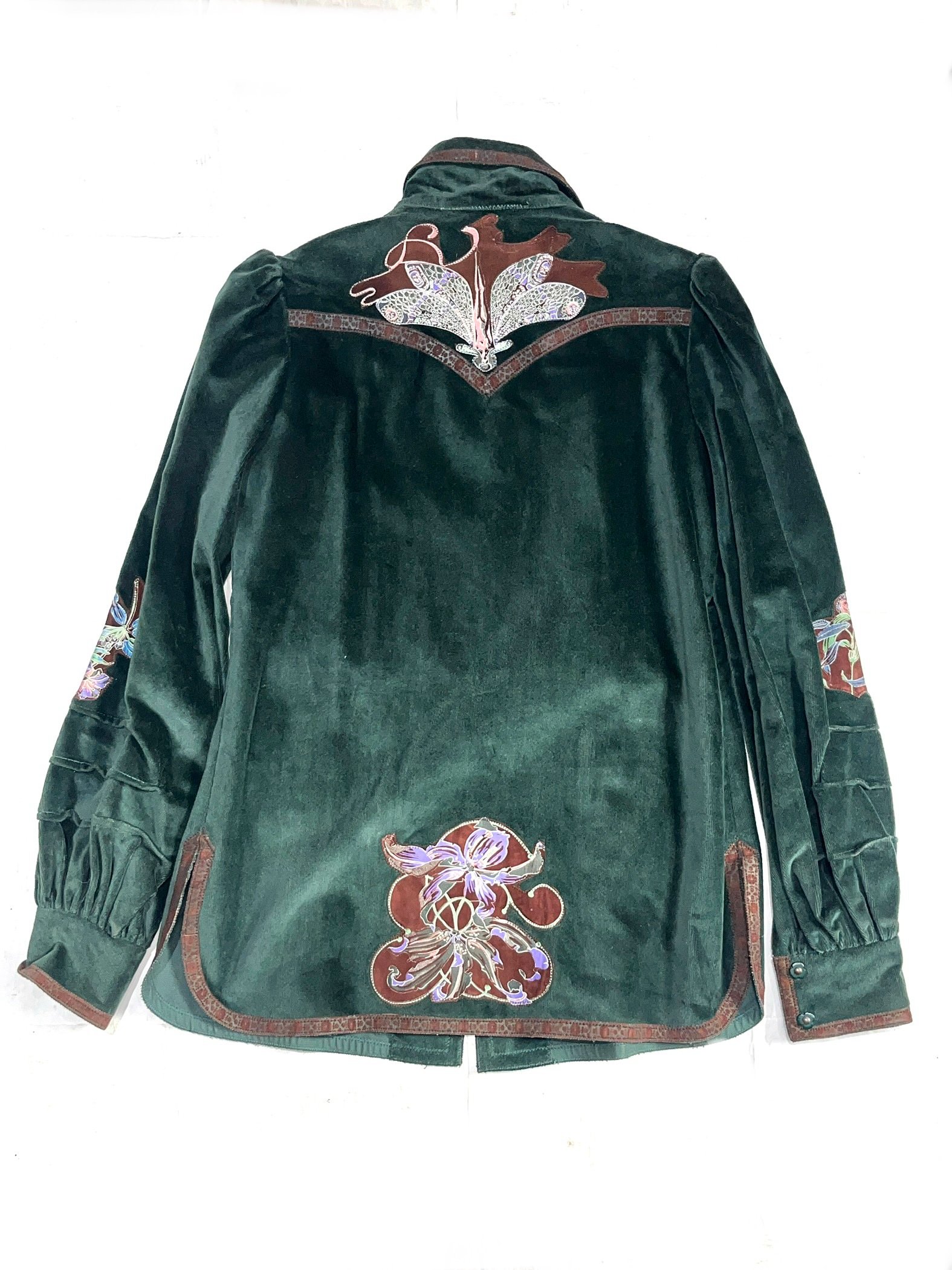 Features embroidered floral motifs across the jaxket and sleeves, combined with decorative woven trim along the edges, giving the piece a distinctive vintage Cavalli identity.