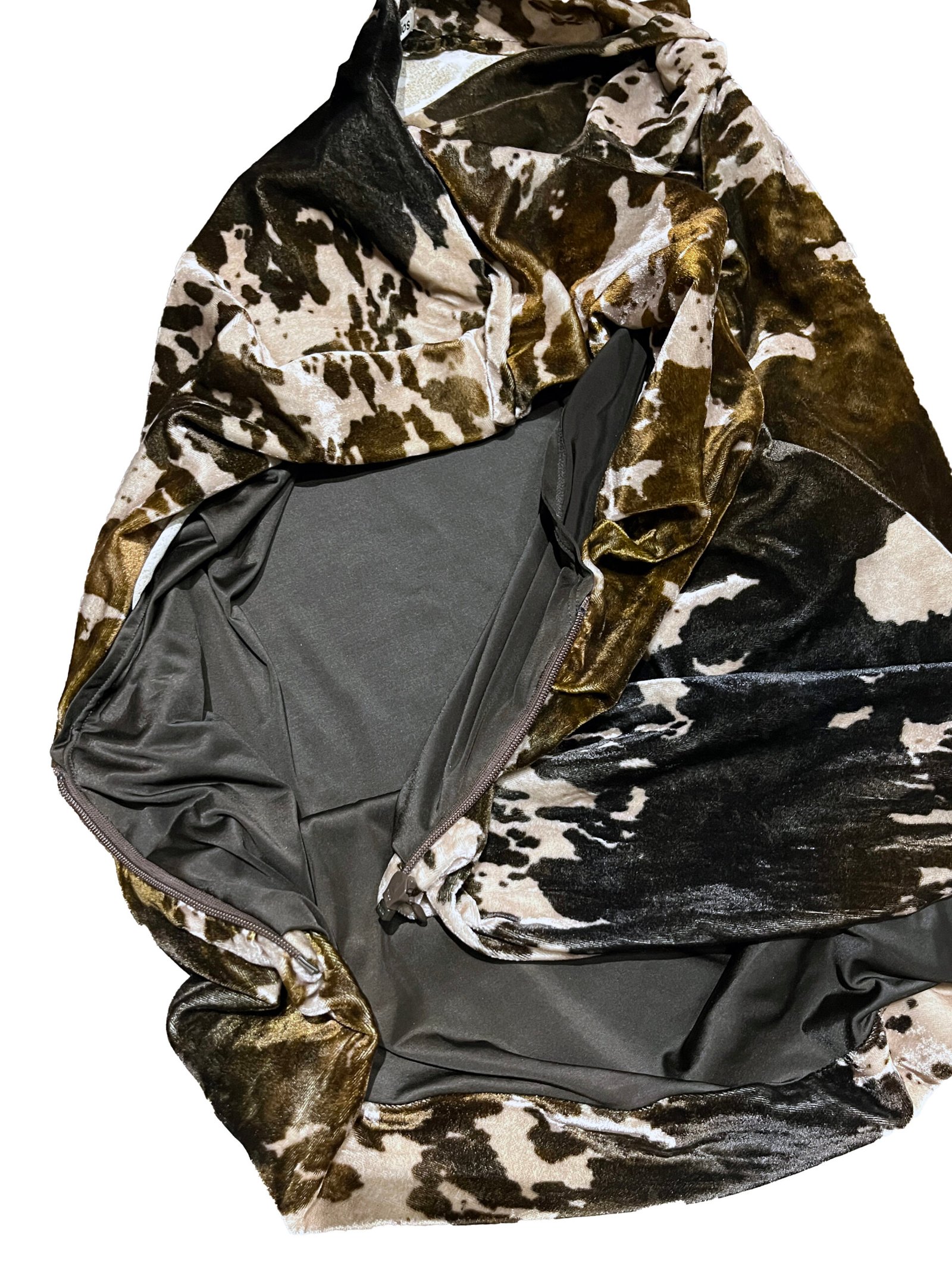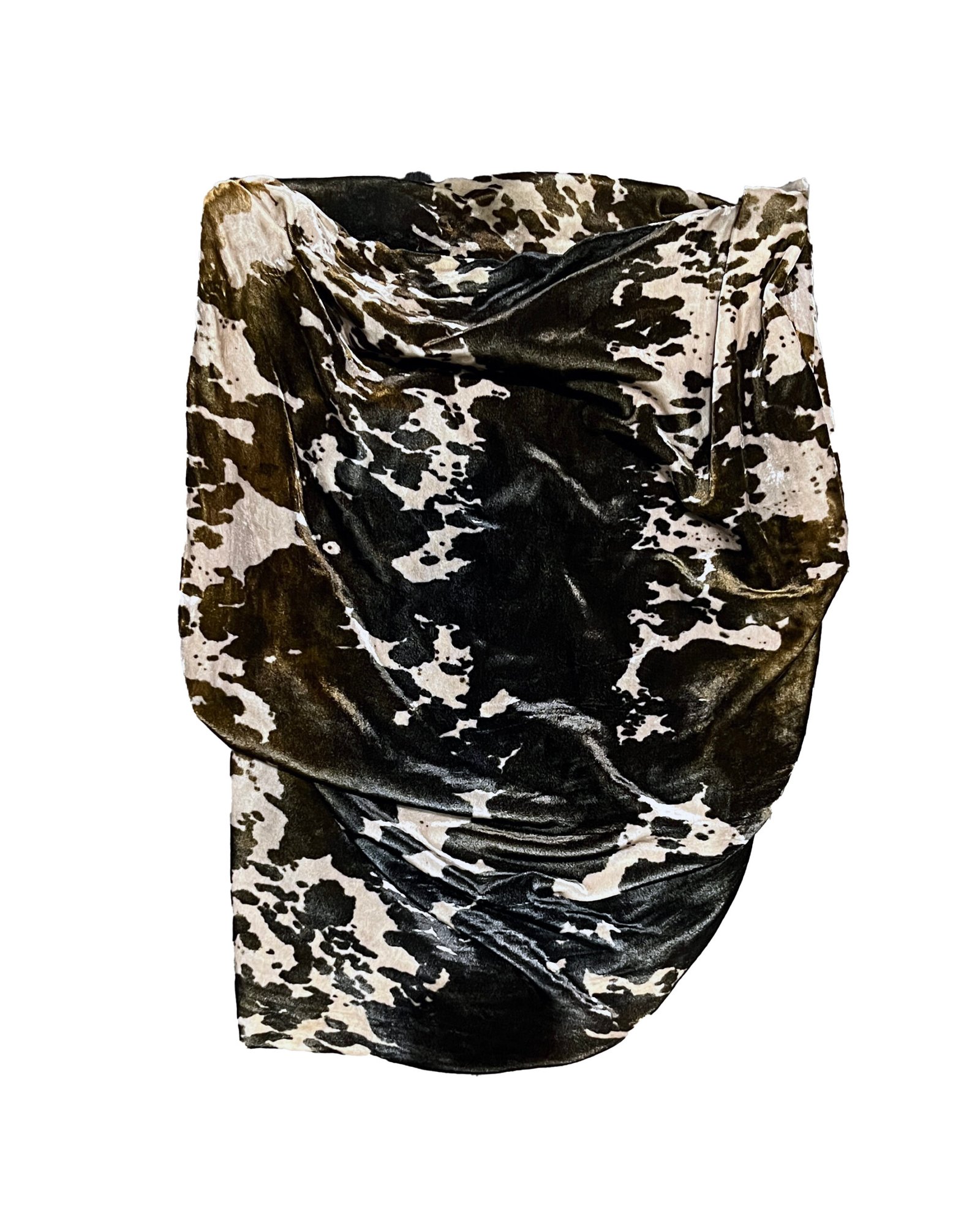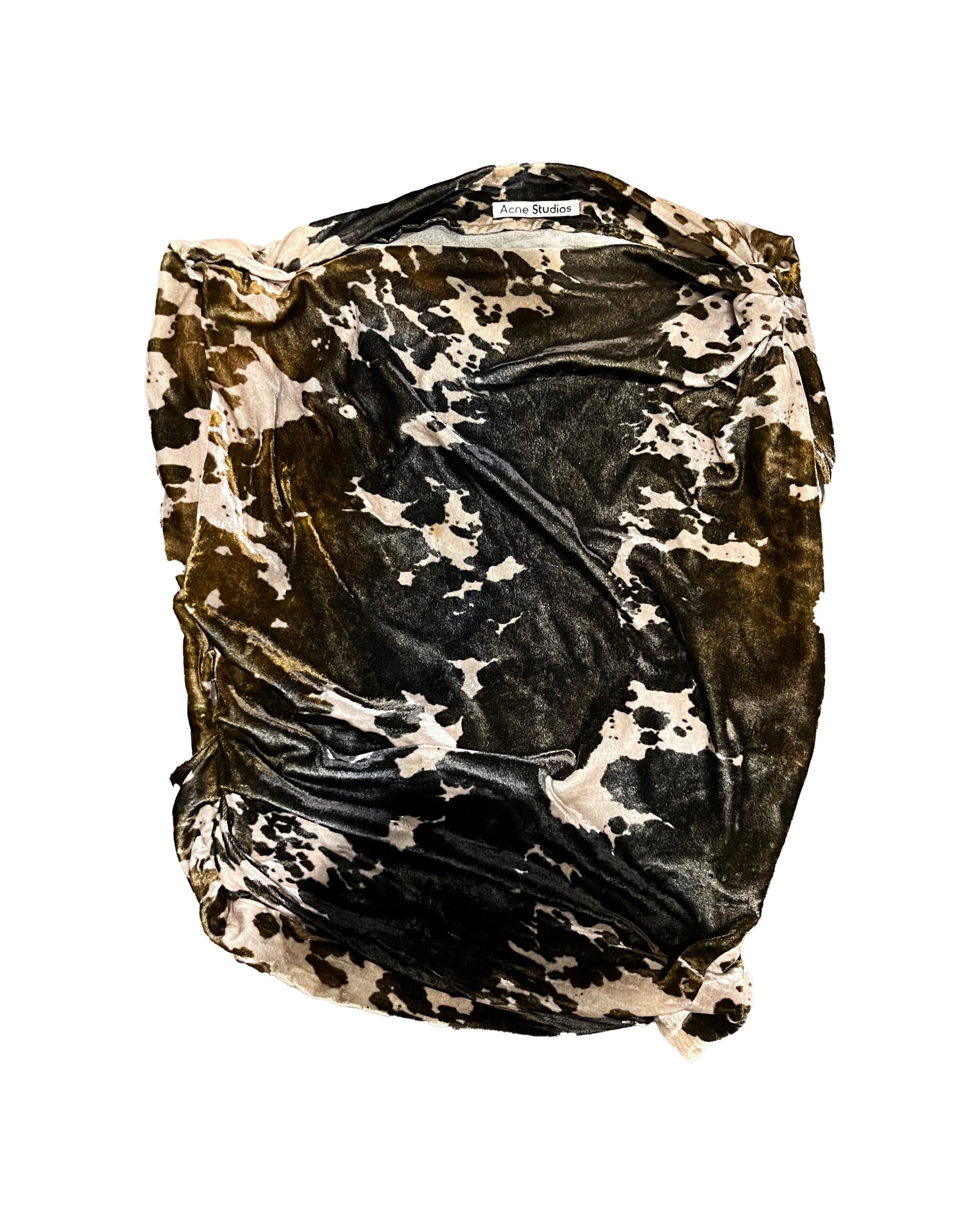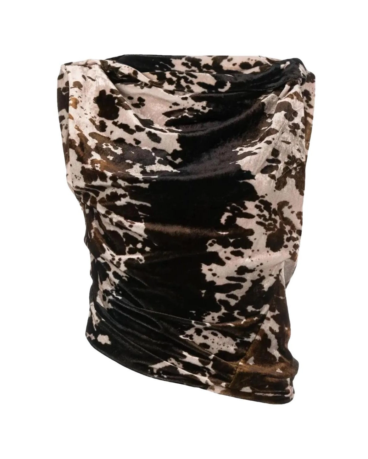 Acne Studios draped top in a soft velvet texture, featuring an abstract cow print in earthy tones.