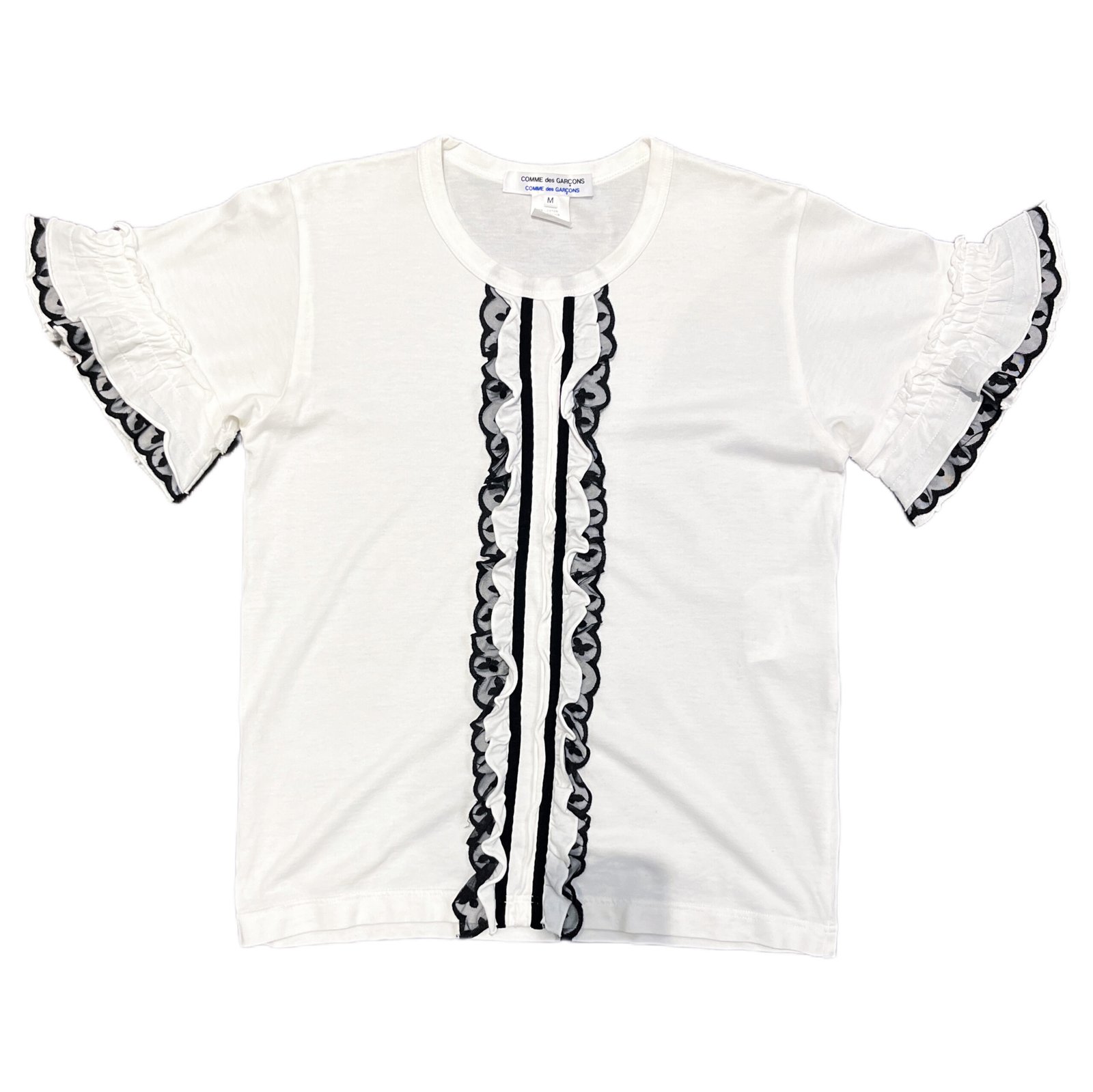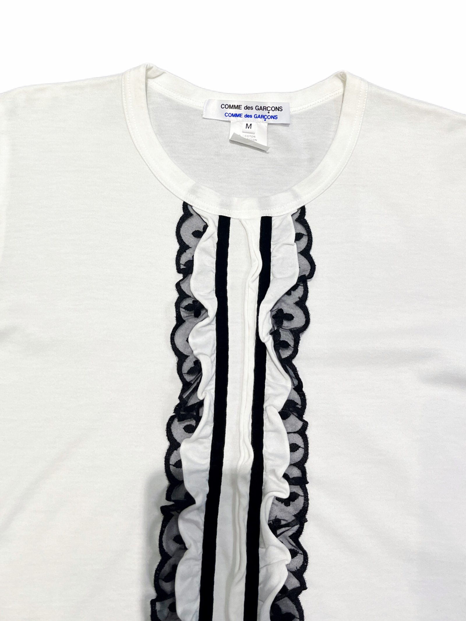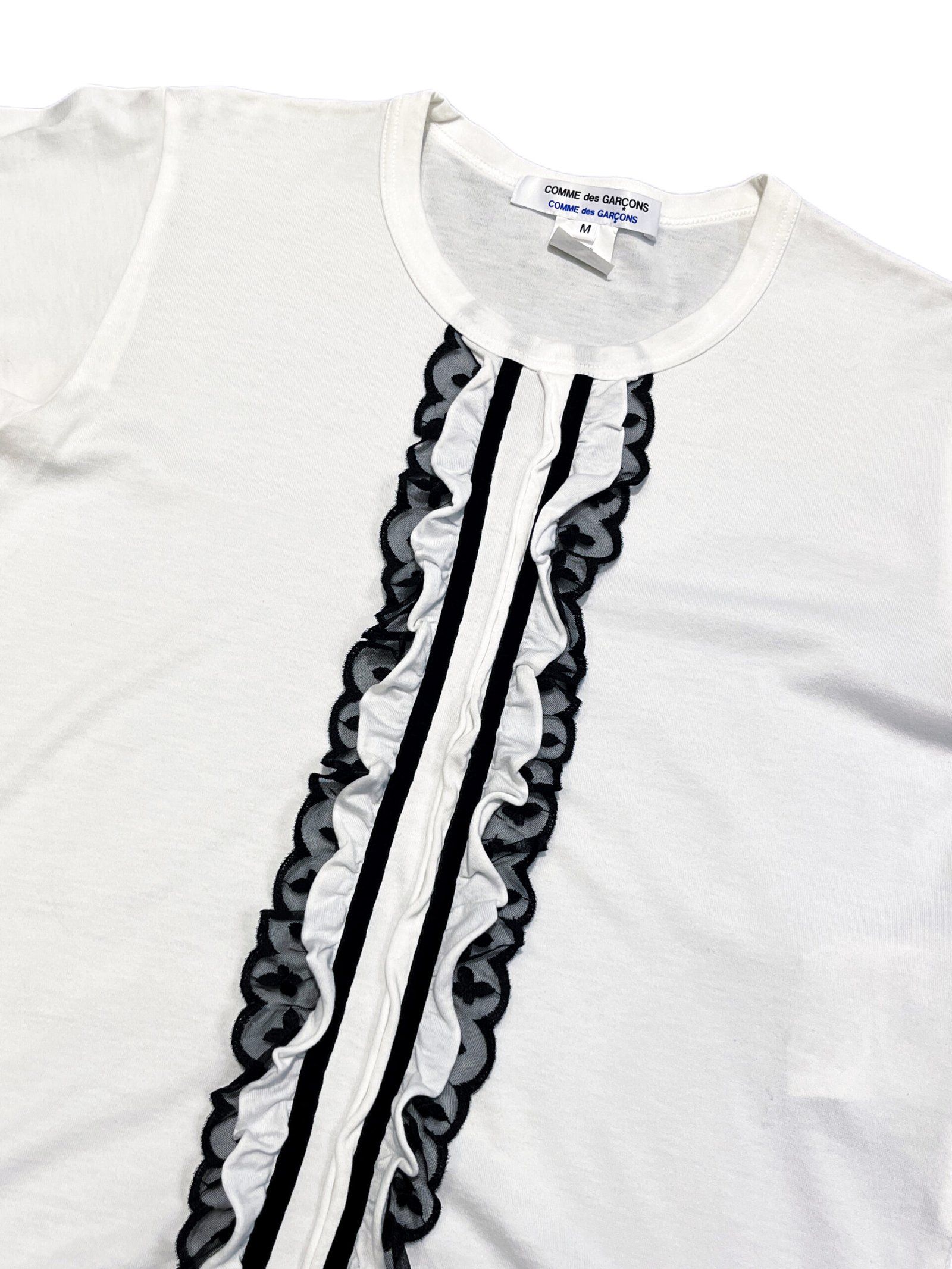White cotton top from COMME des GARÇONS COMME des GARÇONS featuring a vertical ruffle panel at the front, framed with black lace trim and velvet tape detailing.