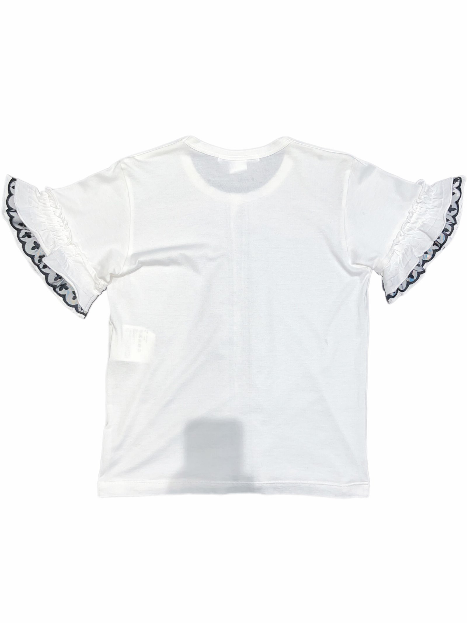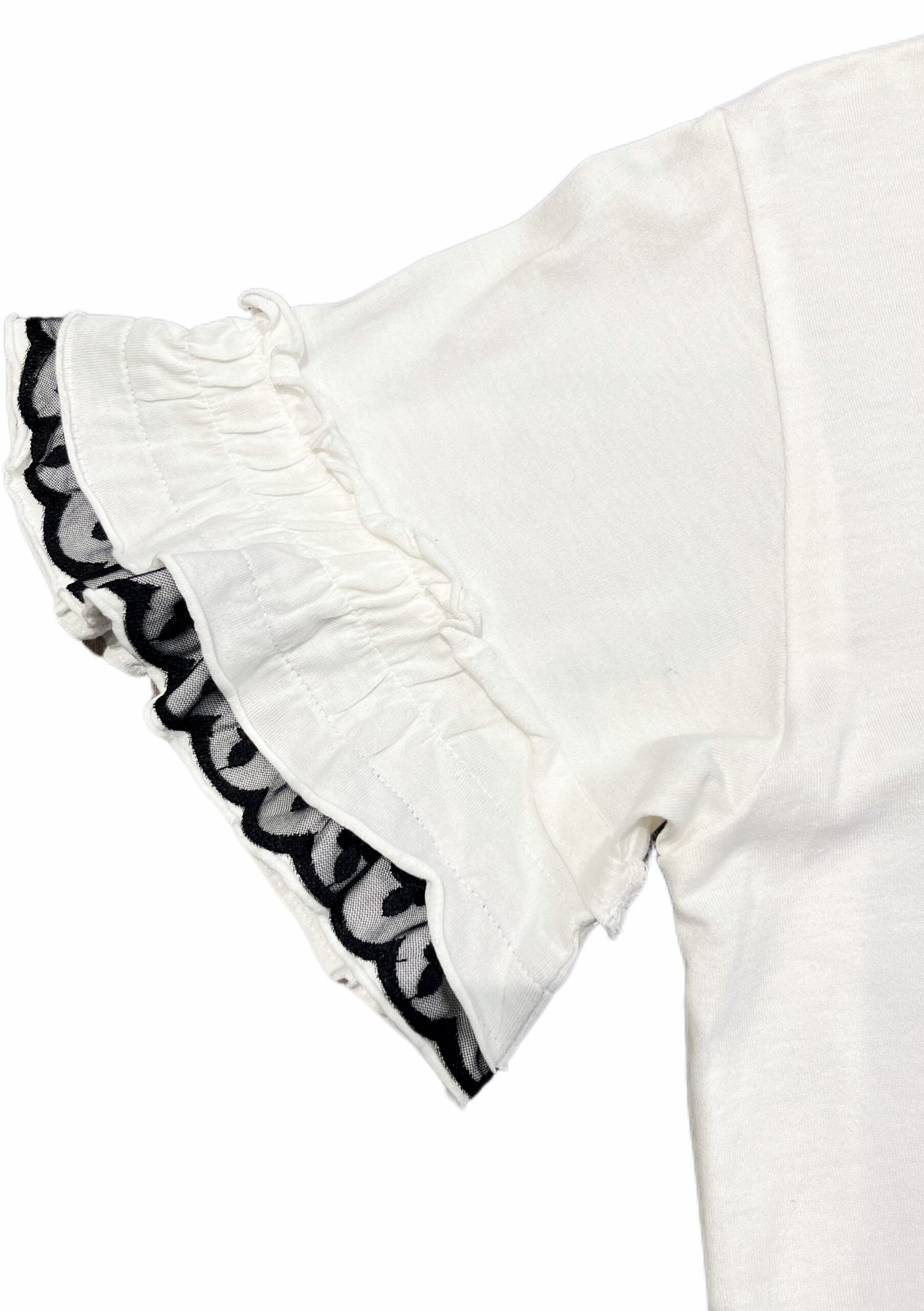 Short sleeves are finished with gathered ruffle edges and matching lace trim.