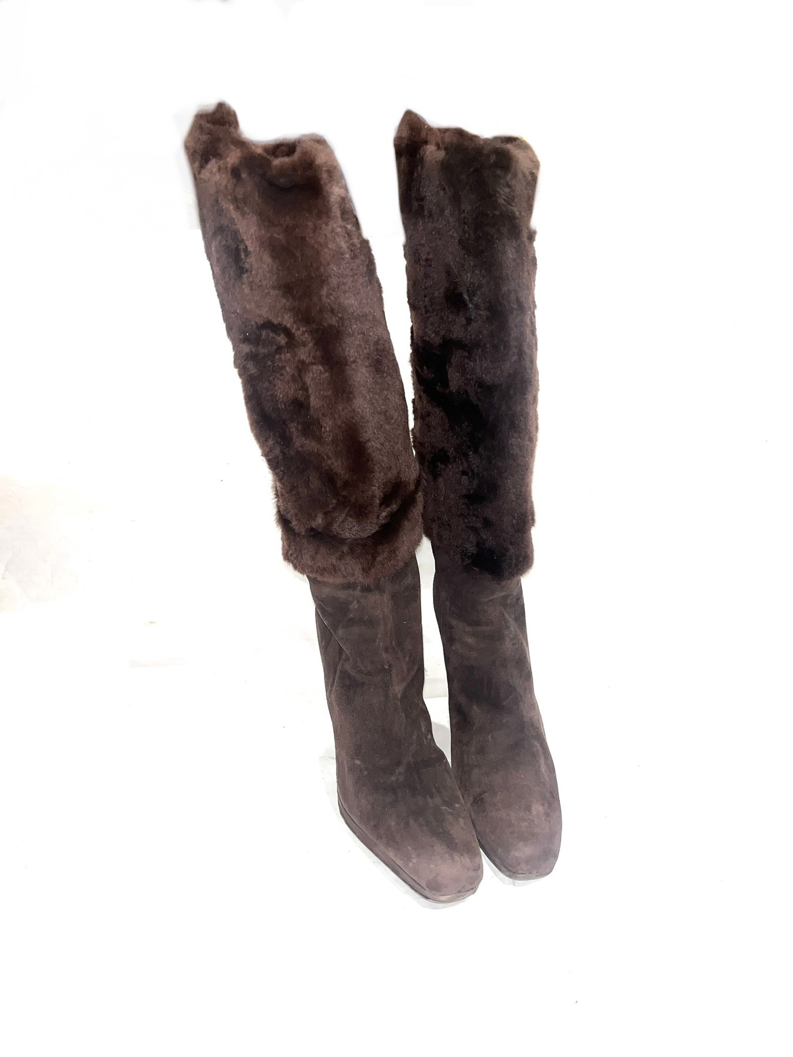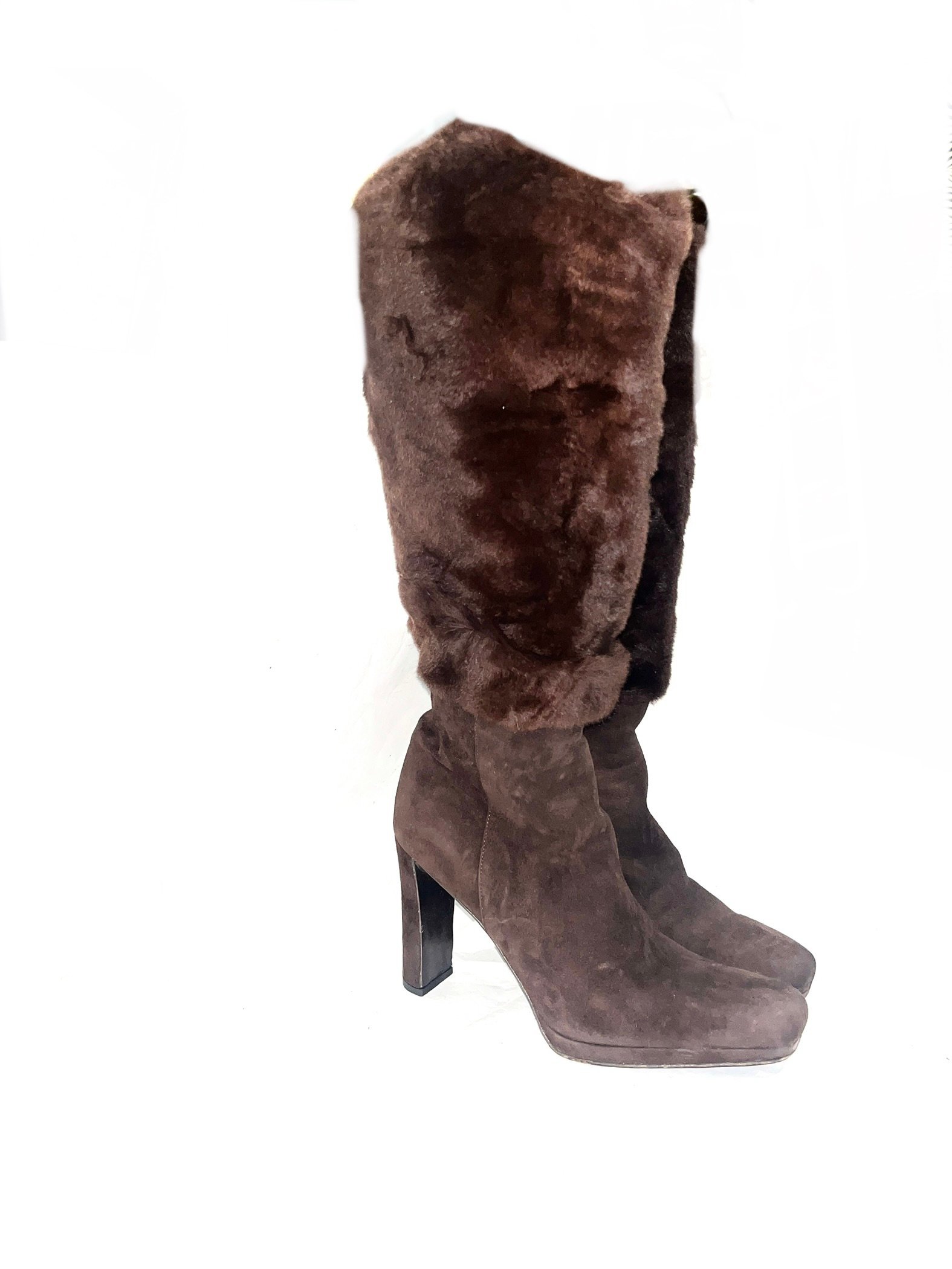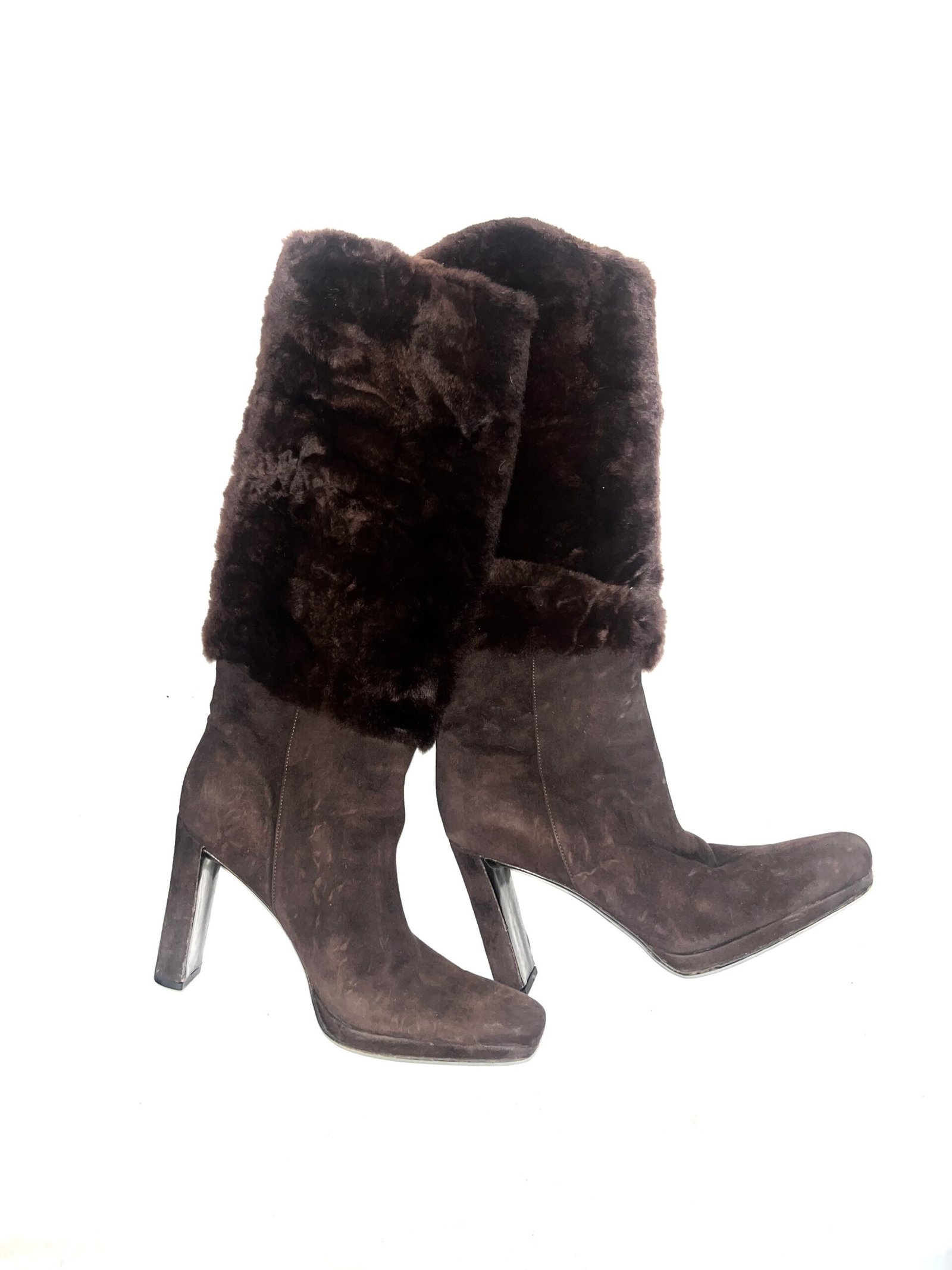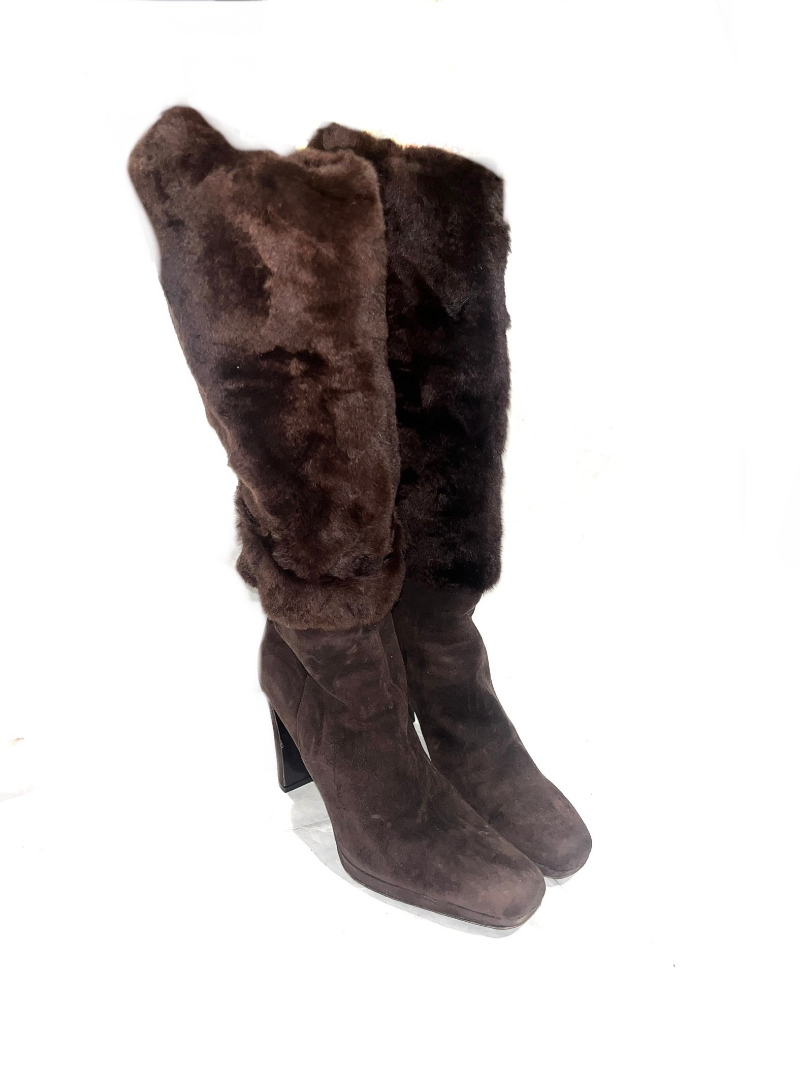 Prada Knee-high boots with full shearling upper and suede lower.