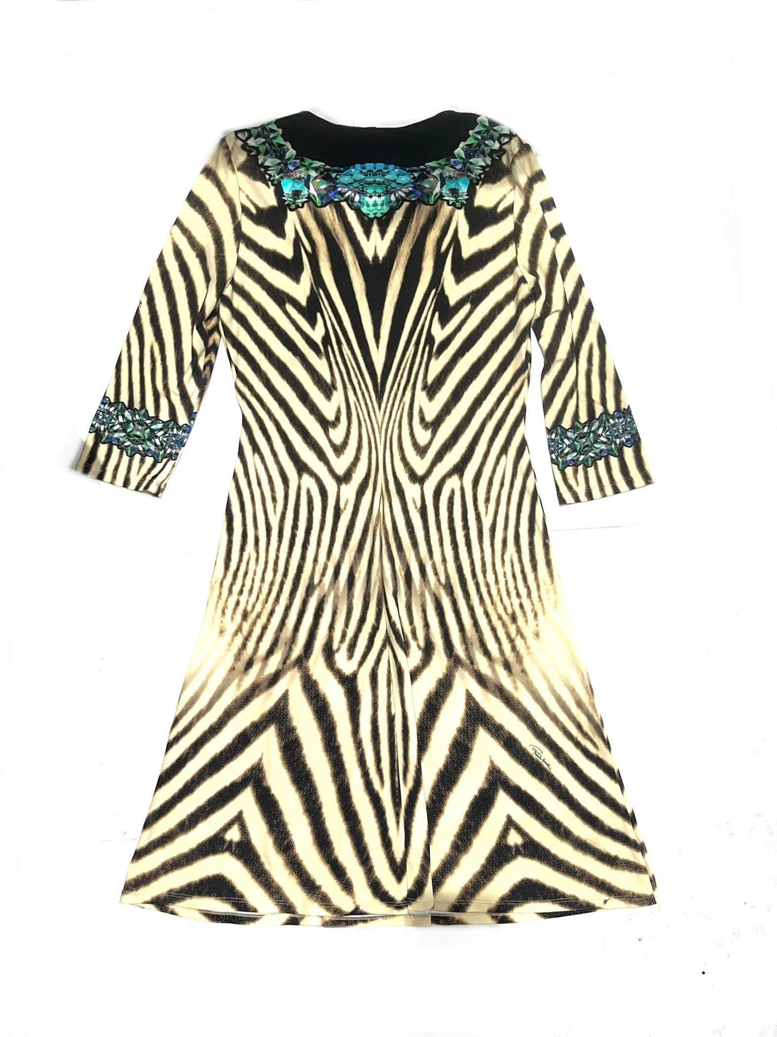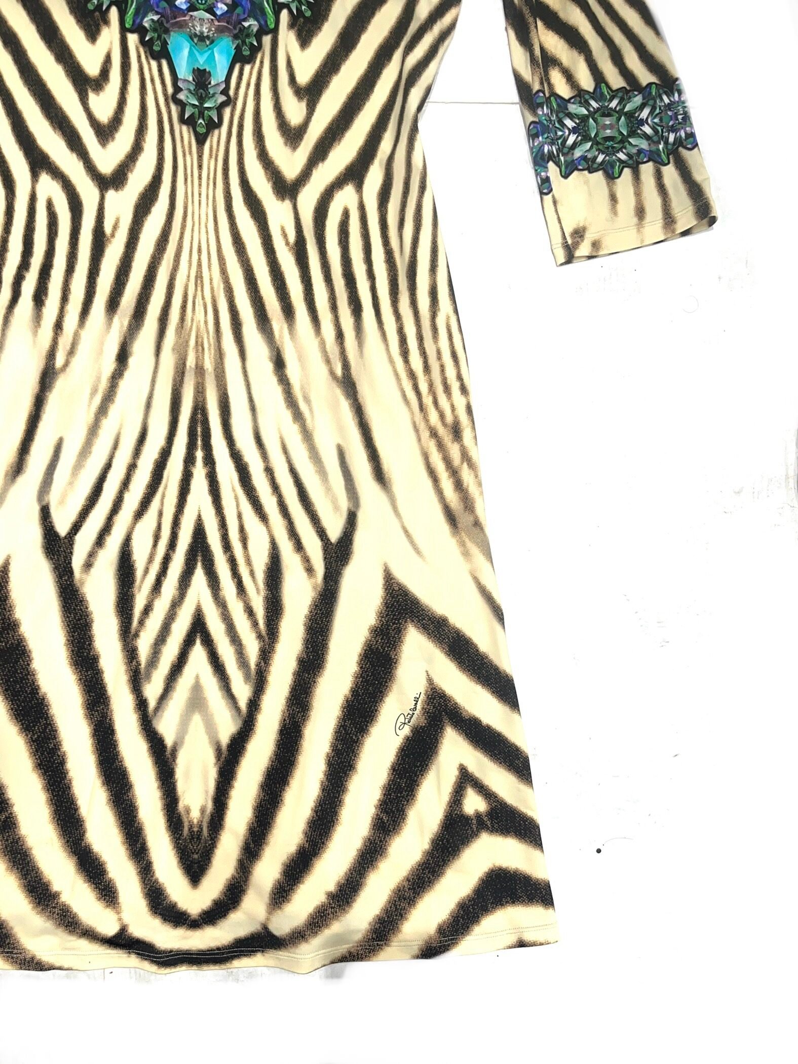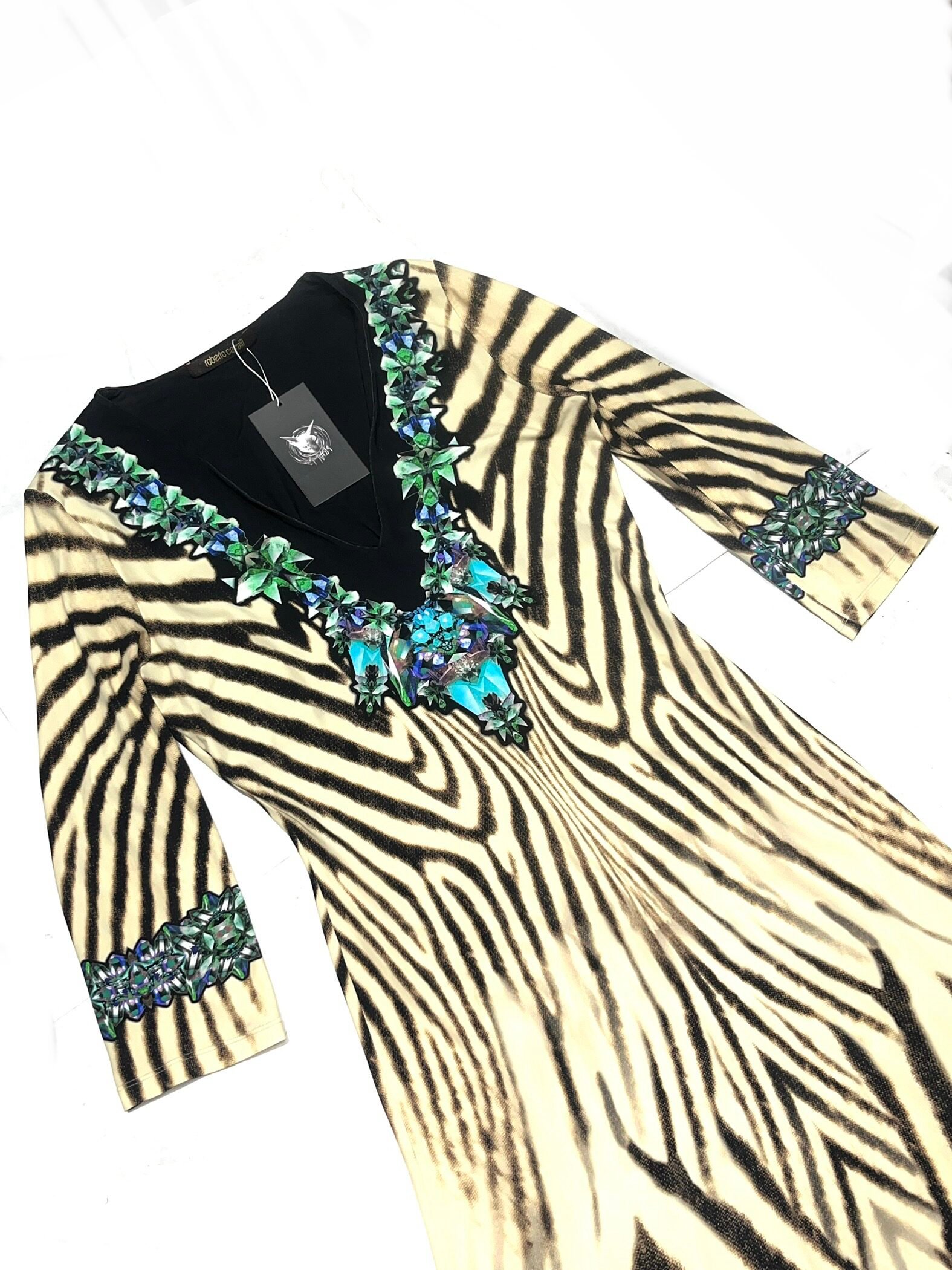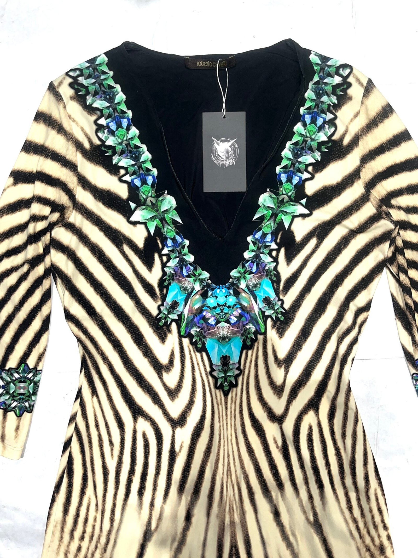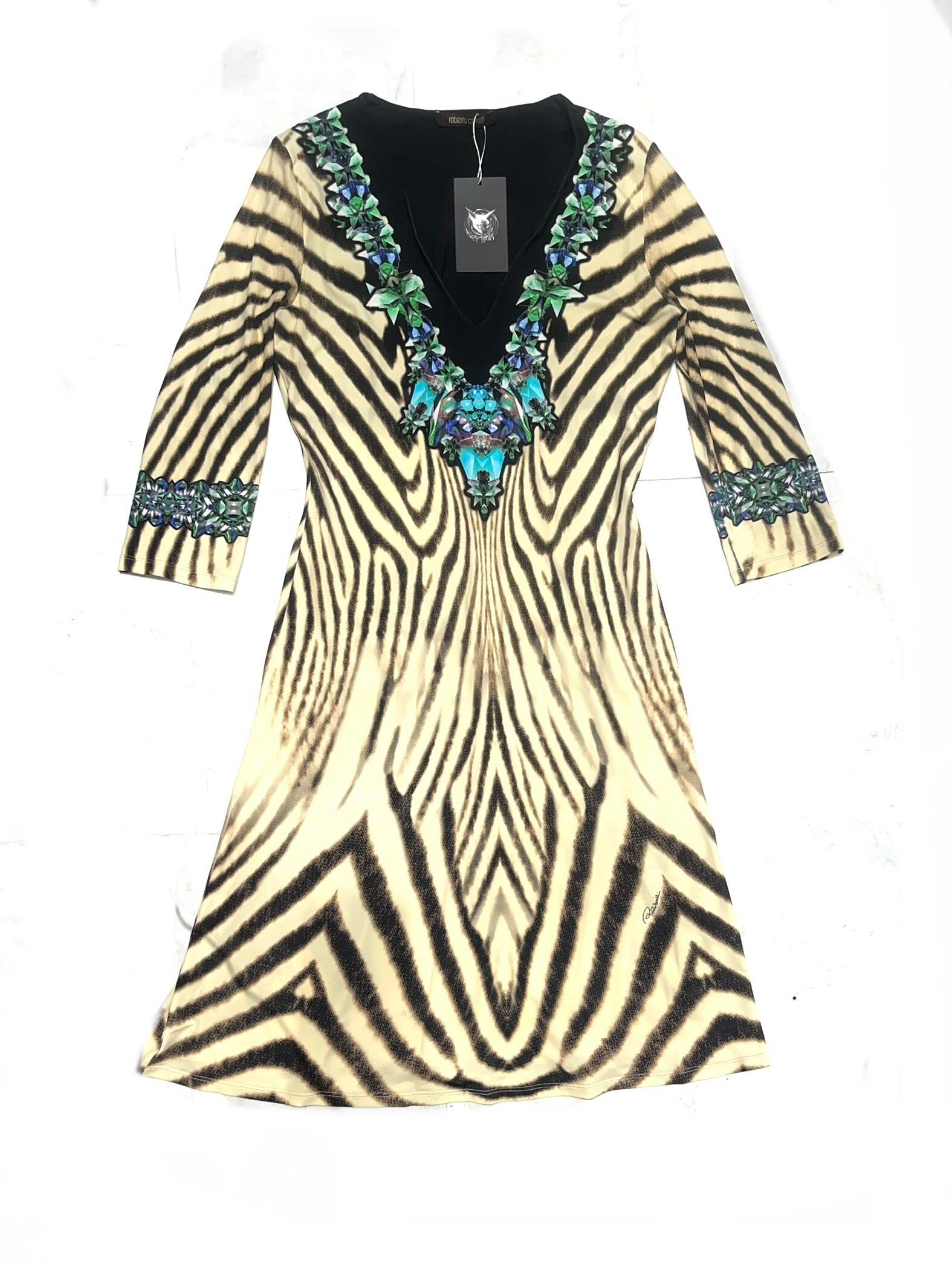 Roberto Cavalli mainline dress featuring a bold zebra print with a deep V neckline.