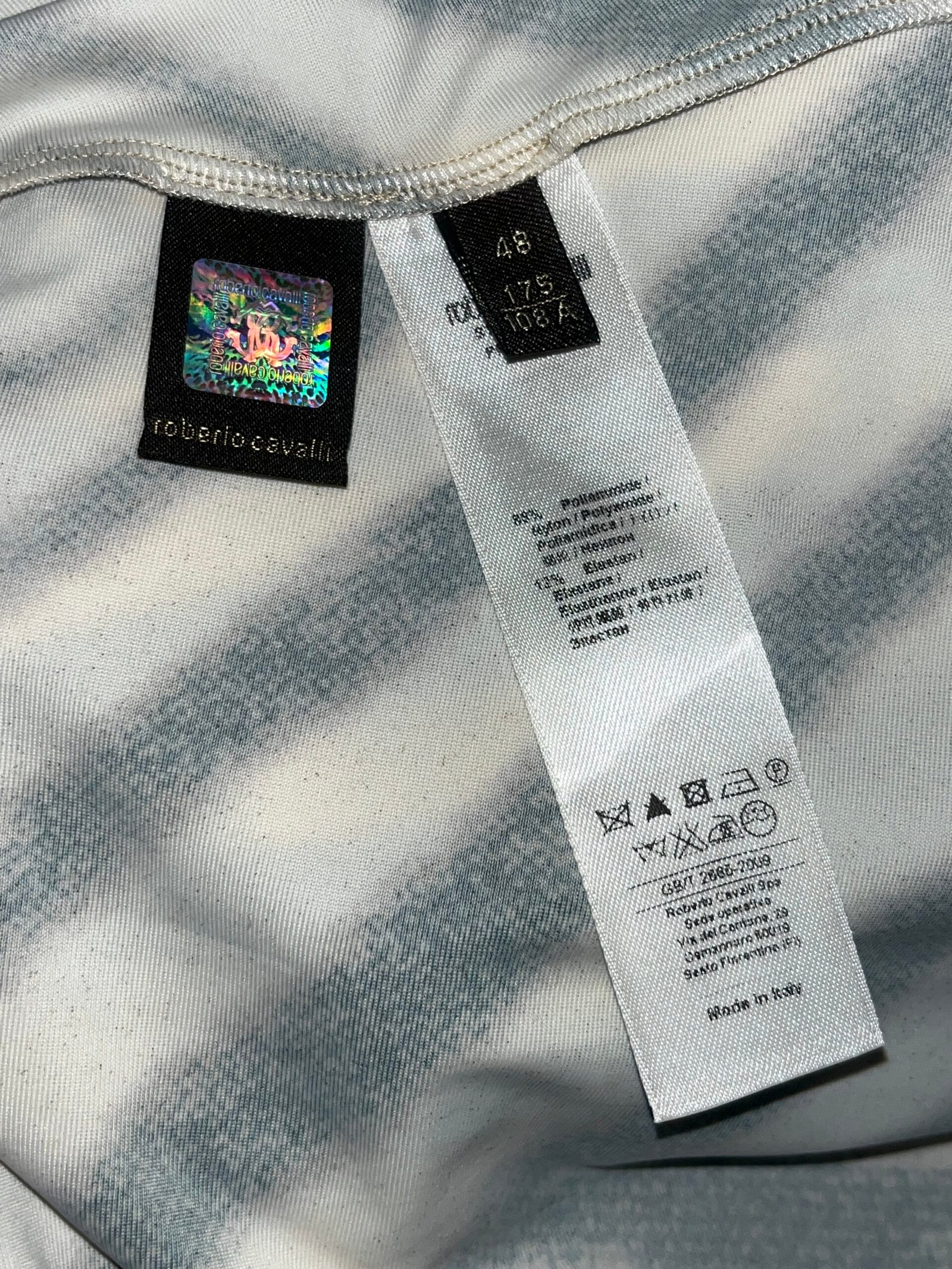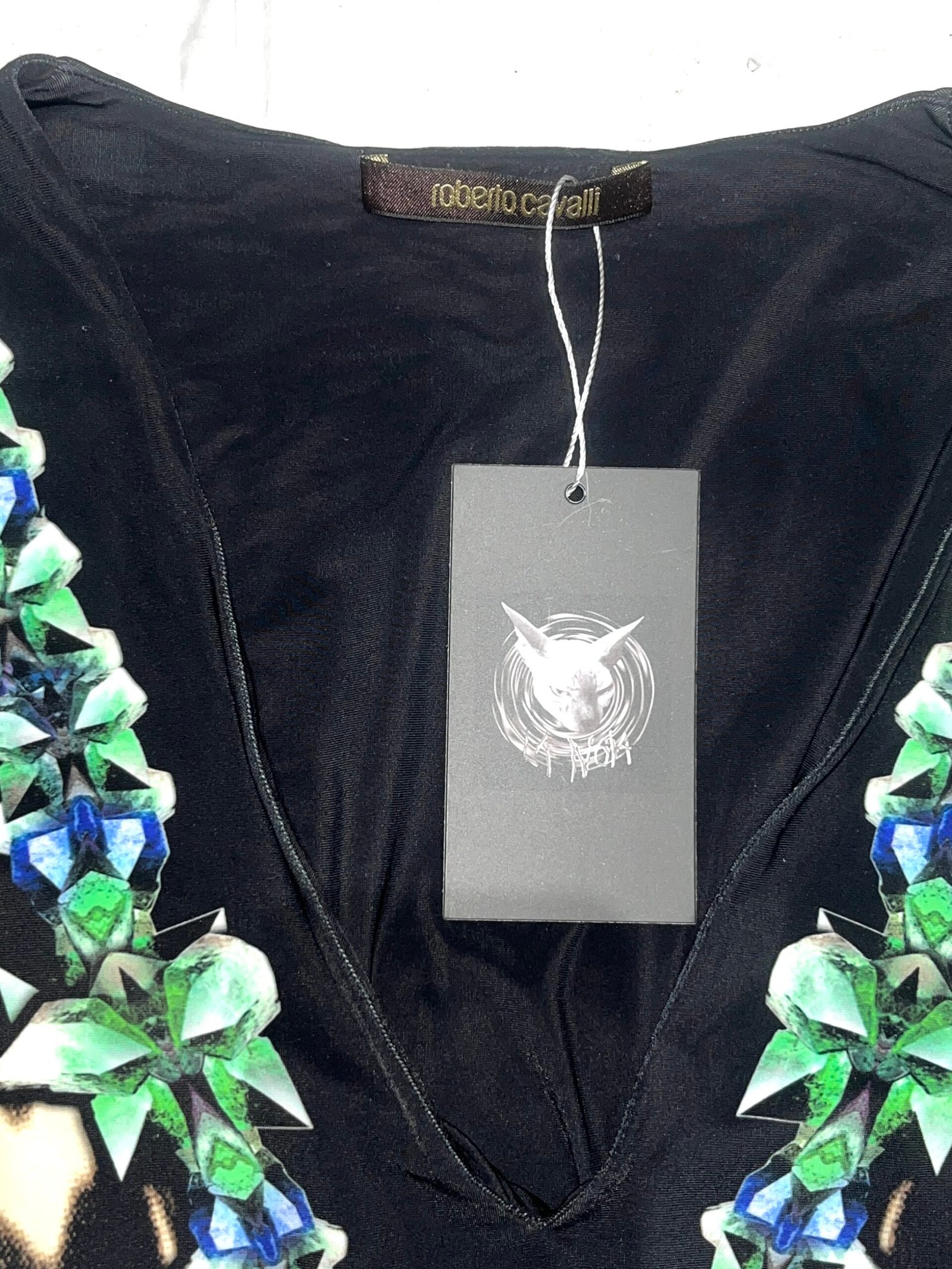 Body-skimming silhouette with strong visual impact, classic Cavalli maximalism.