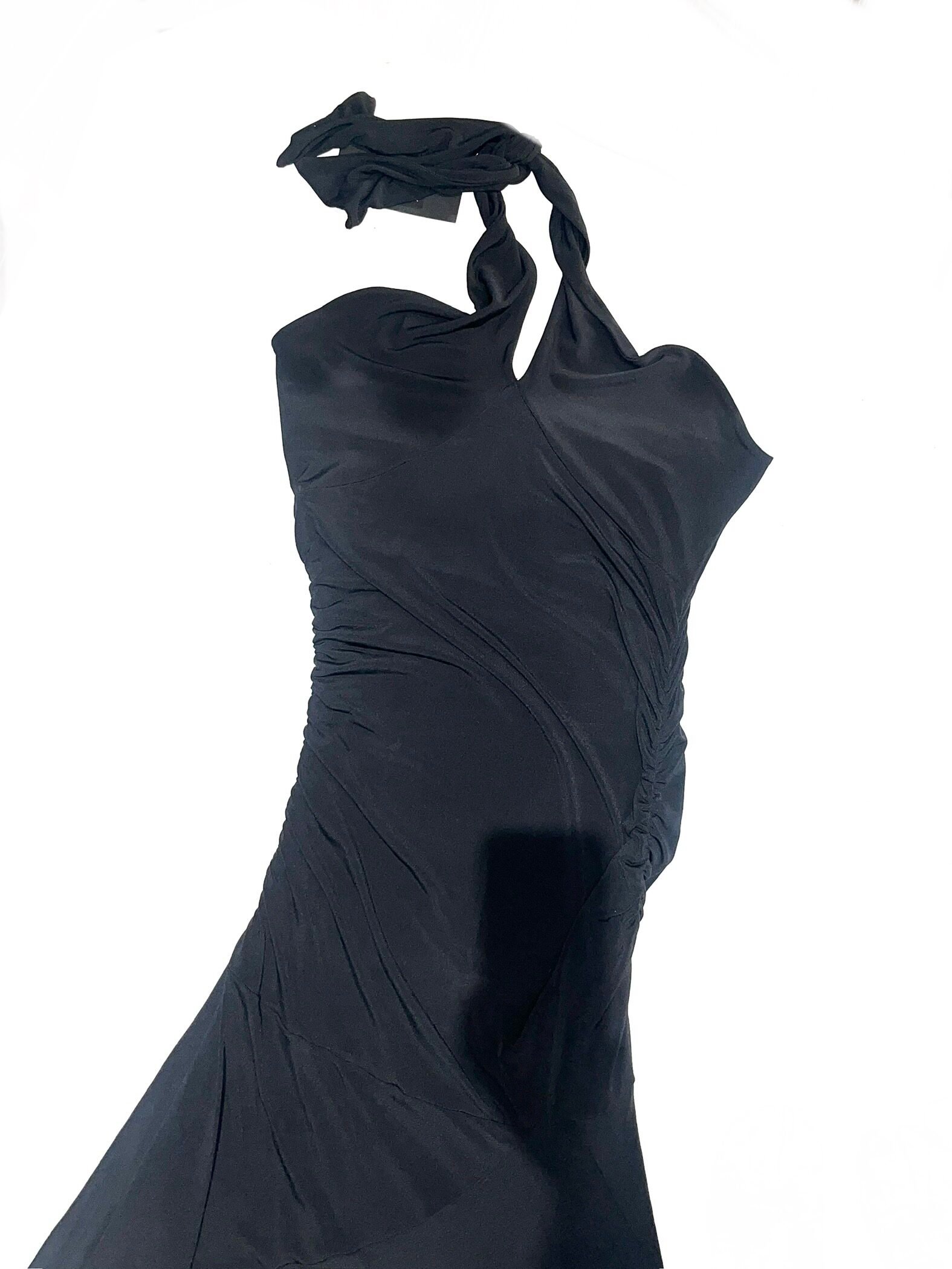 Y2K halter neck maxi dress featuring a fully open back and asymmetrical layered hem.