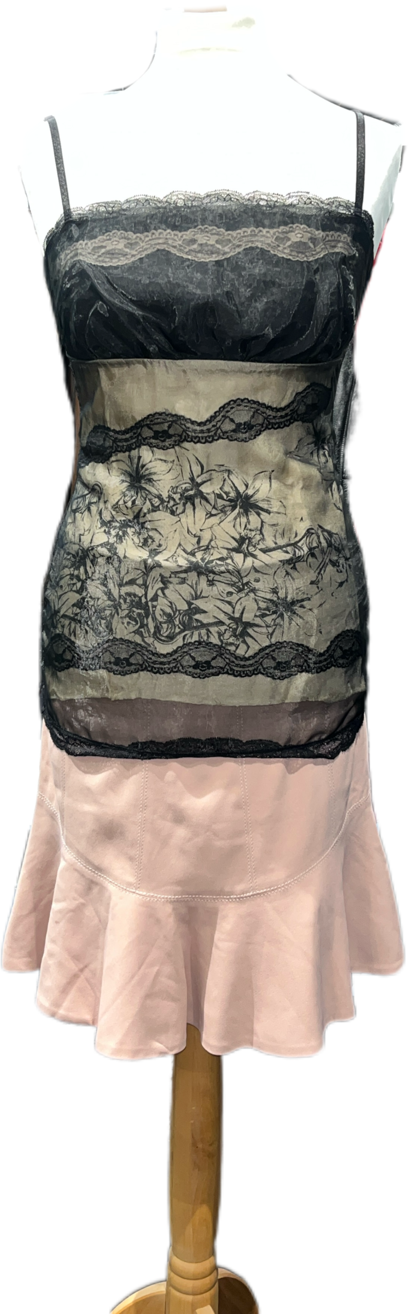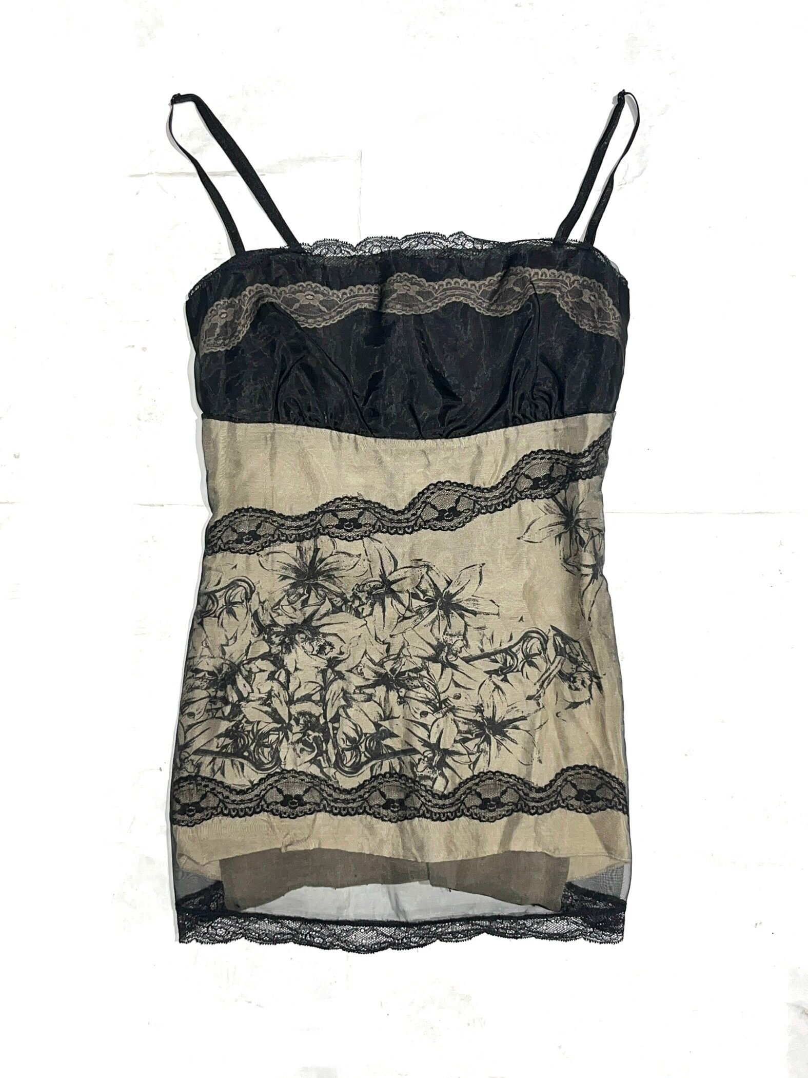 2000s mesh tank top featuring lace panels and floral graphic print.