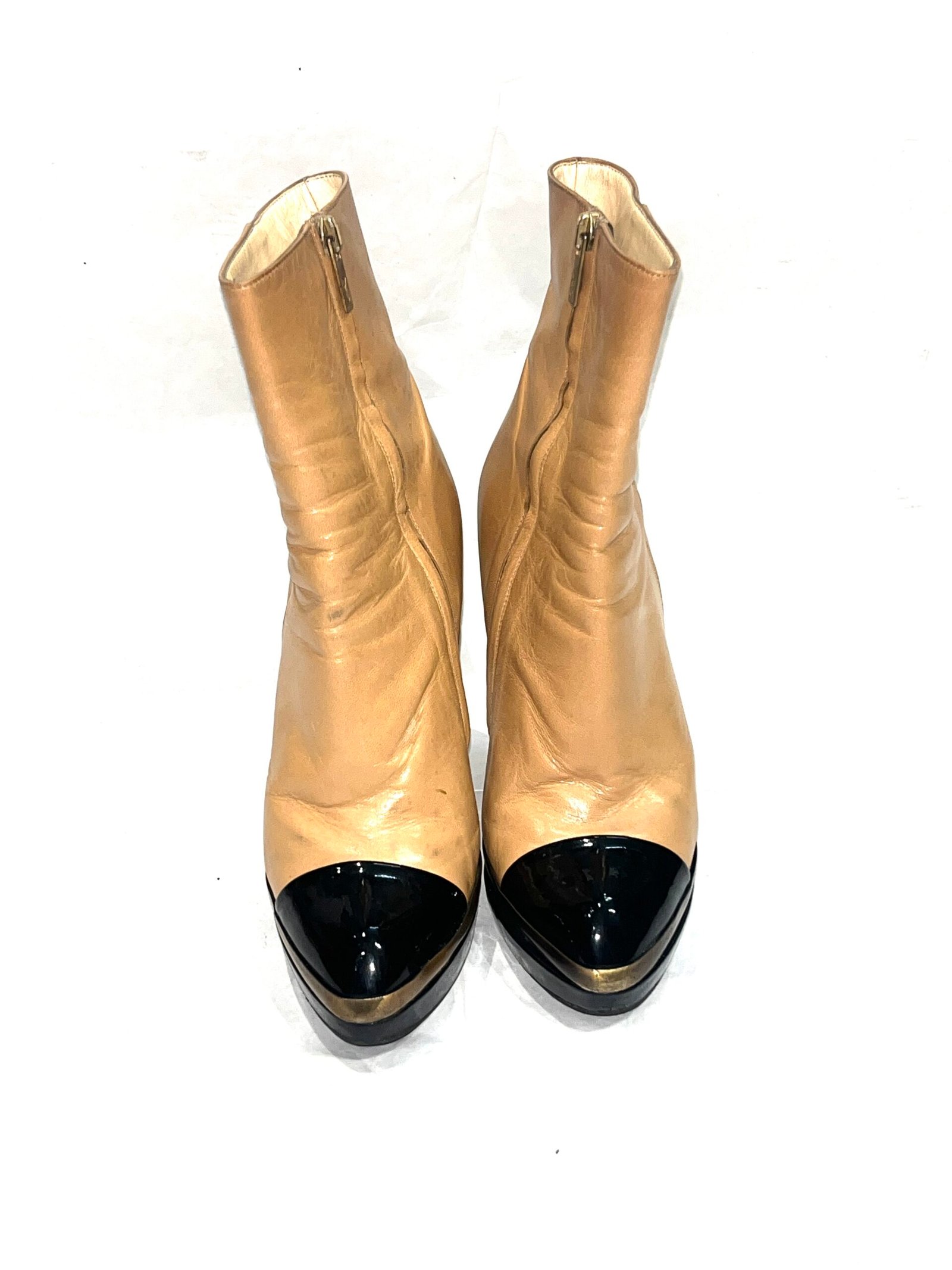 YSL Ankle boots with contrasting patent cap toe and slim heel. Clean, slightly sculpted silhouette with subtle platform.